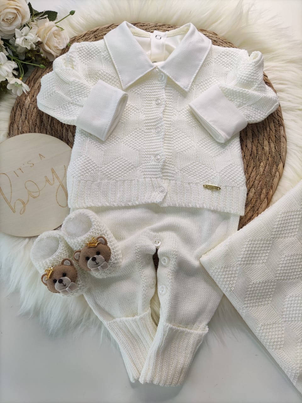 Celebre os primeiros momentos do seu bebê com aconchego, estilo e elegância. Nossos conjuntos de saída de maternidade são confeccionados artesanalmente em tricot, com atenção especial aos detalhes que fazem toda a diferença.